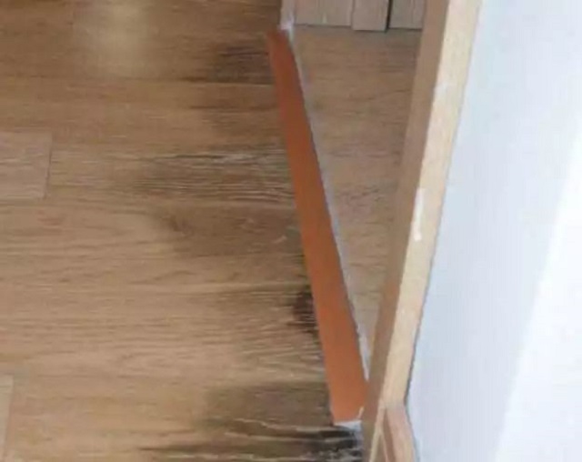 情況三、閉水(shuǐ)試驗沒有問題,門(mén)泡了,衛生(shēng)間門(mén)口闆發黑(hēi)。